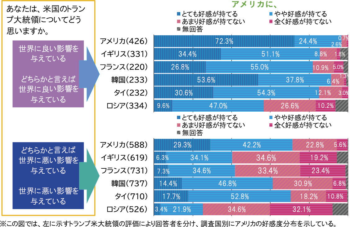 図表4は、トランプが世界に良い影響を与えているか、それとも悪い影響を与えているかという人々の印象により、アメリカの好感度が大きく異なっていることを示している。