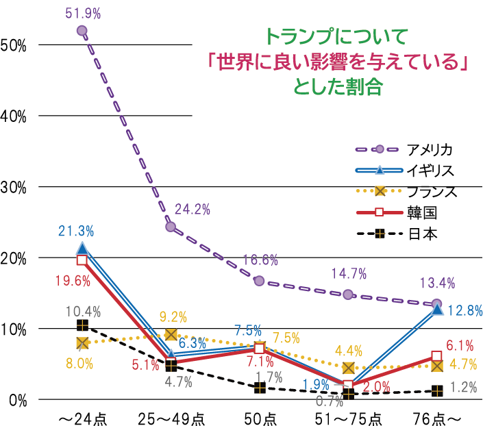 前号記事で報告されたように、今回調査した国ではいずれもトランプを悪影響とする割合はかなり高かった。国際報道上も、ここ1、2年でアメリカの悪印象を強めた出来事の多くがトランプ政権由来であると考えられることから、トランプ政権がアメリカの好感度悪化の明確な要因であると考えられる。