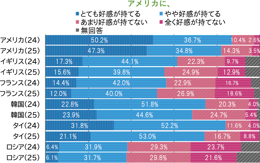 図表2は、24年、25年調査での各国のアメリカに対する好感度の分布を示している。これを見ると、左の「とても好感が持てる」の側ではタイを除き小幅な変動となっている一方、右側の「あまり好感が持てない」、「まったく好感が持てない」の割合(以下、これを合計した値を嫌悪割合とする)がロシア以外の各国で伸びていることが分かる。