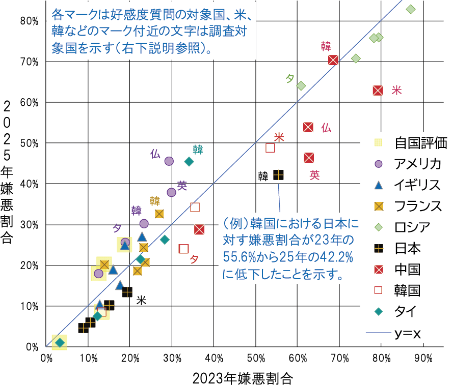 この図を見ると、多くのマークは23年と25年の嫌悪割合が同一であることを示すy=xの斜線よりも右下に位置していることが分かる。特に、日本、韓国、中国、タイのアジア各国に対する嫌悪割合は概ねy=xの右下に位置しており、23年に比べて25年にはこれら各国の嫌悪割合が低下したことが分かる。中でも報告された韓国での日本の嫌悪割合の低下は顕著である(注1)。これは最後に取り上げたい。