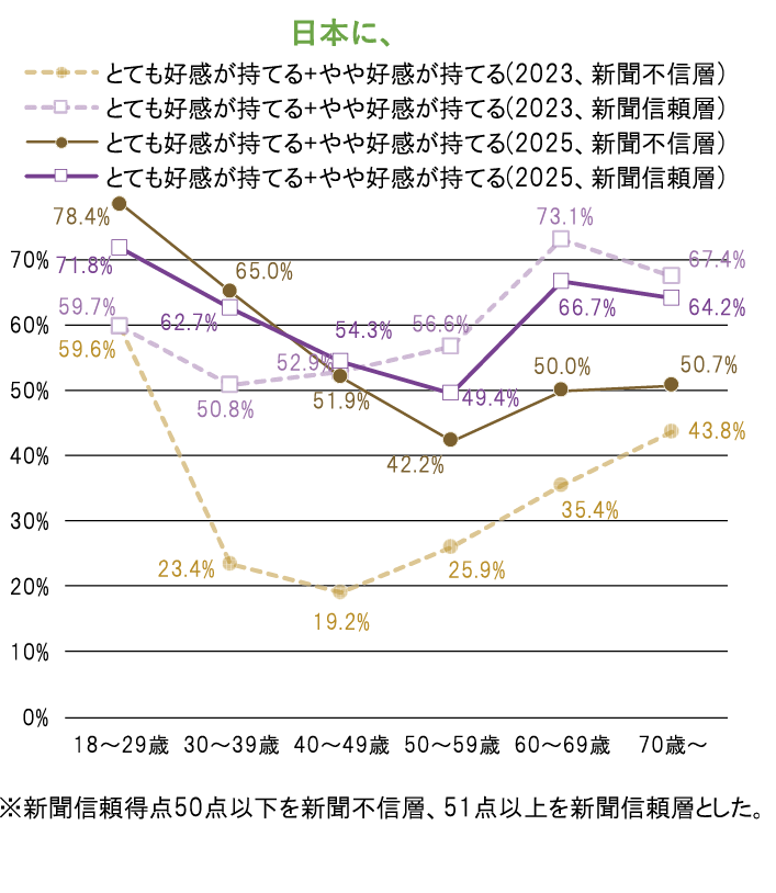 韓国の大手紙は保守派が強いことから、新聞不信層は進歩(革新)派と重なる部分が大きいと考えられる。したがって、日本の好感度の大きな改善は、進歩派の大統領の下で日本との関係が良化したことが背景にあると考えられる。25年調査の直前には日韓首脳会談が行われ、良好な関係を双方ともアピールした。