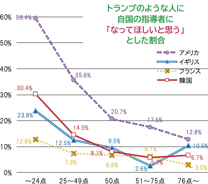 (注5)質問文(邦文)は「あなたは、米国のトランプ大統領のような人に、自国の指導者になってほしいと思いますか」である。選択肢は「なってほしいと思う」、「なってほしいと思わない」に「どちらかと言えば」を付したものを合わせた4択である。