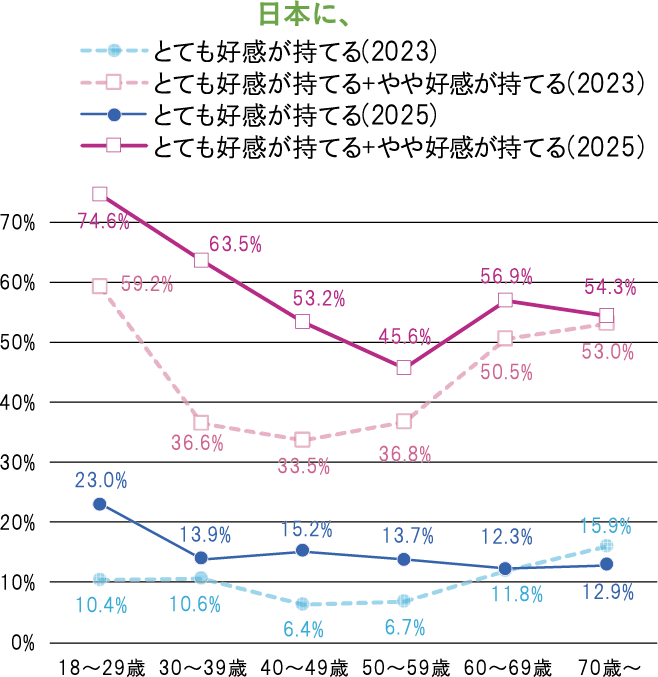 図表11は、韓国における2023年と2025年の日本の好感度分布を年齢層別に集計したものである。「とても好感が持てる」、「やや好感が持てる」を合わせた割合で見ると、36.6%から63.5%となった30歳代の上昇幅が最も大きく、次いで40歳代の上昇が目立つ。30歳未満の層はもともと日本への好感度が高いことから、上昇幅はほどほどである。この図からは、30歳代、40歳代を中心に概ね50歳代以下で日本の好感度が上昇したと言える。