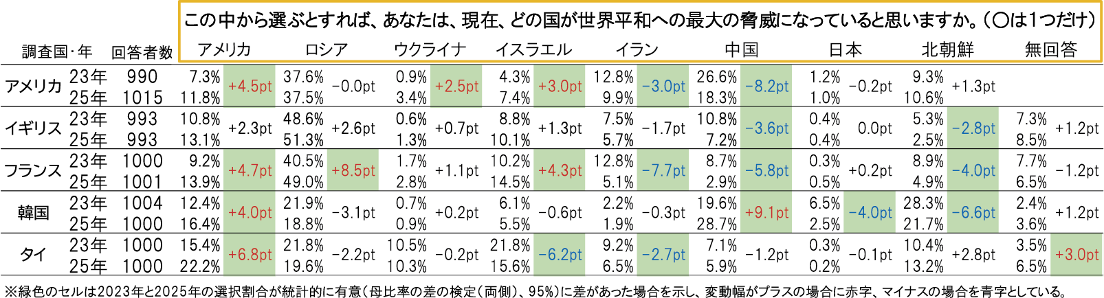 このほか注目される点としては、韓国で中国の割合が高まり、日本と北朝鮮の割合が低下していることが挙げられる。黄海などで中国が度重なる挑発的行為を行い、韓中関係が悪化した影響と考えられる。フランスでロシアの選択割合が急増したのは、同国を念頭に志願制の兵役制度が導入された影響と考えられる。アメリカでウクライナの選択割合が伸びているのは、ロシアに宥和(ゆうわ)的な「解決」を迫るトランプ政権による執拗(しつよう)なウクライナ非難の影響が出ていると考えられる。