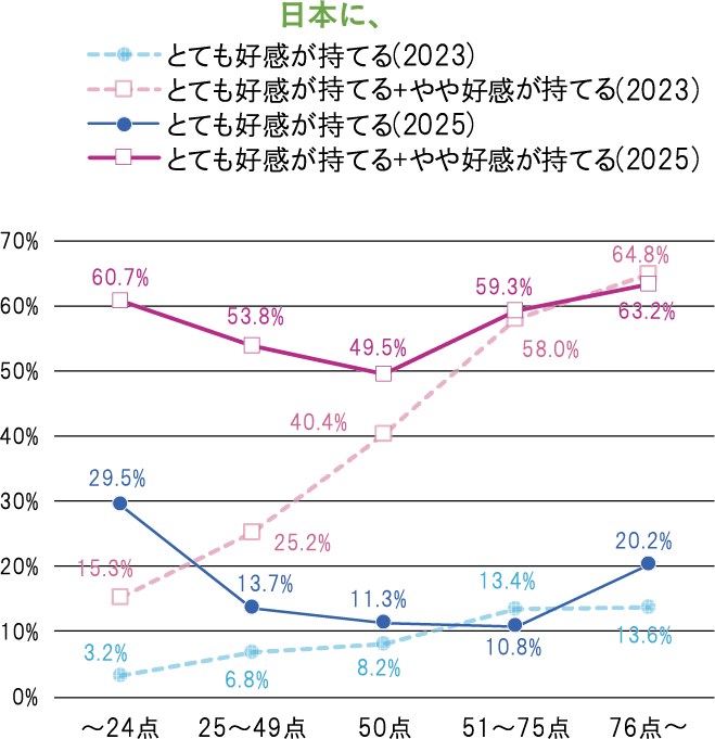 一方、図表12は横軸を新聞信頼得点としたものである。これを見ると、韓国で日本の好感度が上昇した中心層は、新聞信頼得点が低い層だということが分かる。特に得点が24点以下の最下層では、「とても好感が持てる」、「やや好感が持てる」を合わせた割合が23年では15・4%にすぎなかったものが、25年には60・7%と上昇している。このような激増は図表11の各年齢層では見られない。また、新聞信頼得点が低くなるほど上昇幅が大きくなるという傾向も明確である。
