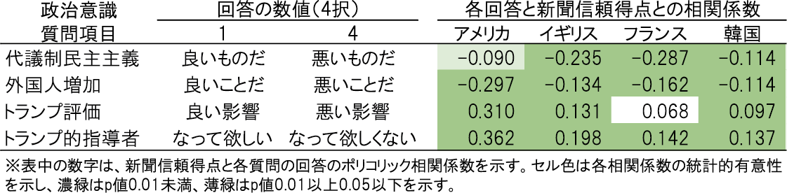 相関係数が正の数字であれば、新聞信頼得点が高ければ各回答の数値が大きいということを示す。たとえば、「トランプ的指導者」のアメリカの値0.362は新聞信頼得点が高いほどトランプ的指導者を望んでいないということを示す。フランスのトランプ評価を除き、全てのセルが統計的に有意であった。