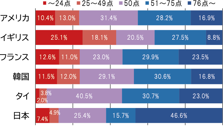図表7は、各国の新聞信頼得点の分布を示したものである。アメリカ、フランス、韓国が似たような分布となる中、イギリスでは24点以下の新聞不信層の割合がかなり高いことが目に付く。これは、同国特有のタブロイド紙の影響と予想される。日本は他国に比べれば新聞が信頼される傾向が強く、新聞読者層が僅少のタイでは不信層もかなり少なくなっている。