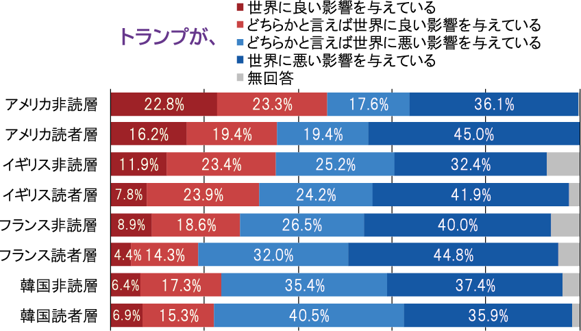図表6は、新聞を読んでいるか否かで回答者を分け、両者のトランプ評価を比較したものである。これを見ると、概ね新聞読者層は非読層に比べてトランプが世界に悪影響をもたらすと評価する傾向にあることが分かる。韓国のみ読者層のトランプ評価が高いが、これは図表6に示される同国新聞読者層のアメリカ好感度の高さで説明できる。つまり、韓国の新聞読者層は非読層に比べて親米傾向が強いため、トランプに対する評価も高めになるのである。